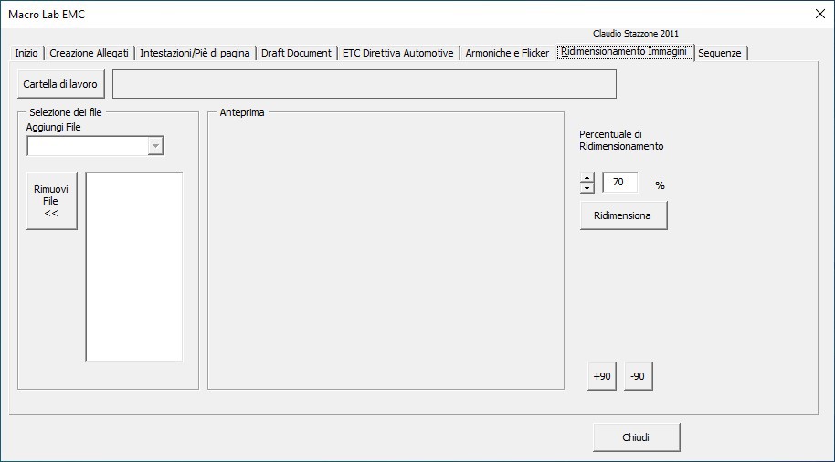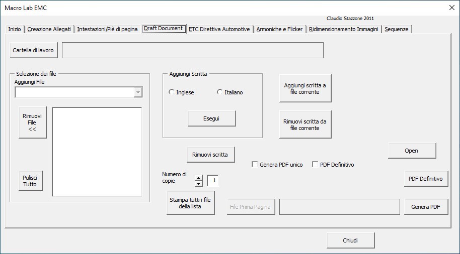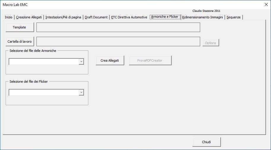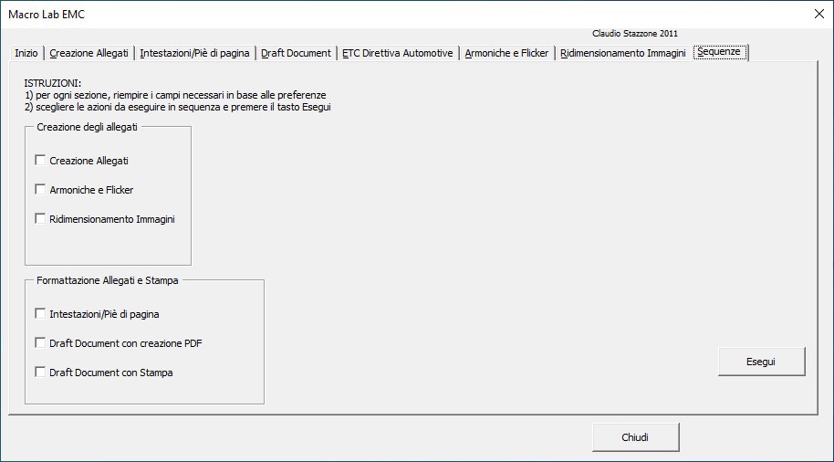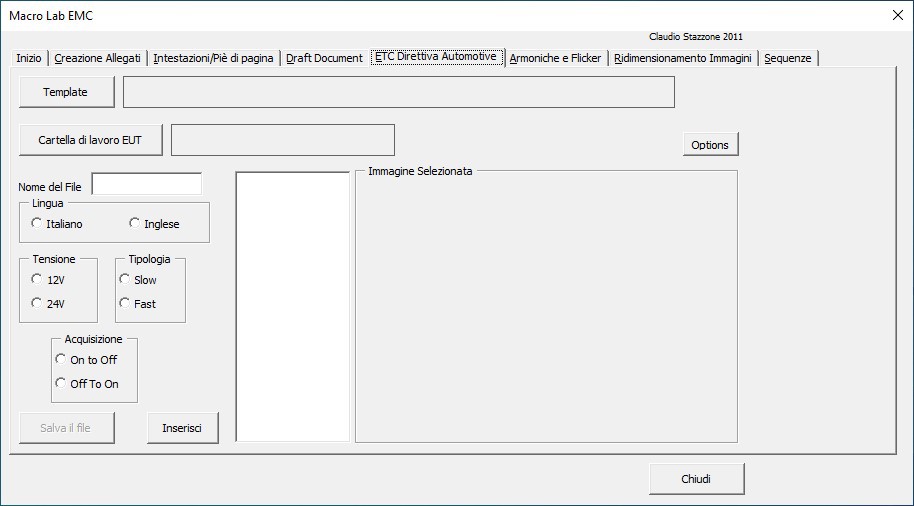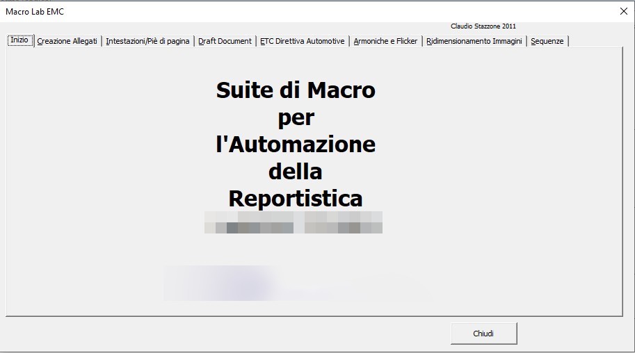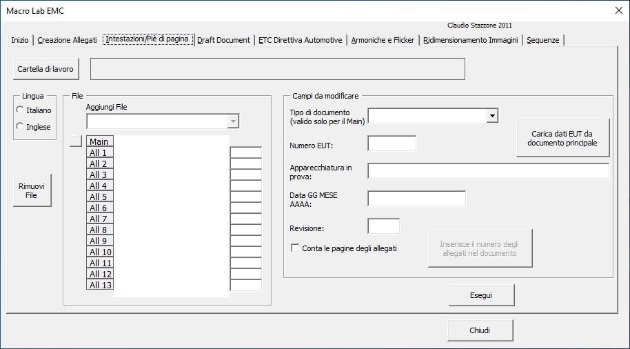 Divisi poi in diverse TAB le varie operazioni che la macro poteva svolgere: il primo tab raffigurato qui sotto consentiva di scrivere le intestazioni del documento: come ad esempio il numero del progetto, il nome del campione sotto test, la data di invio, la revisione del documento.